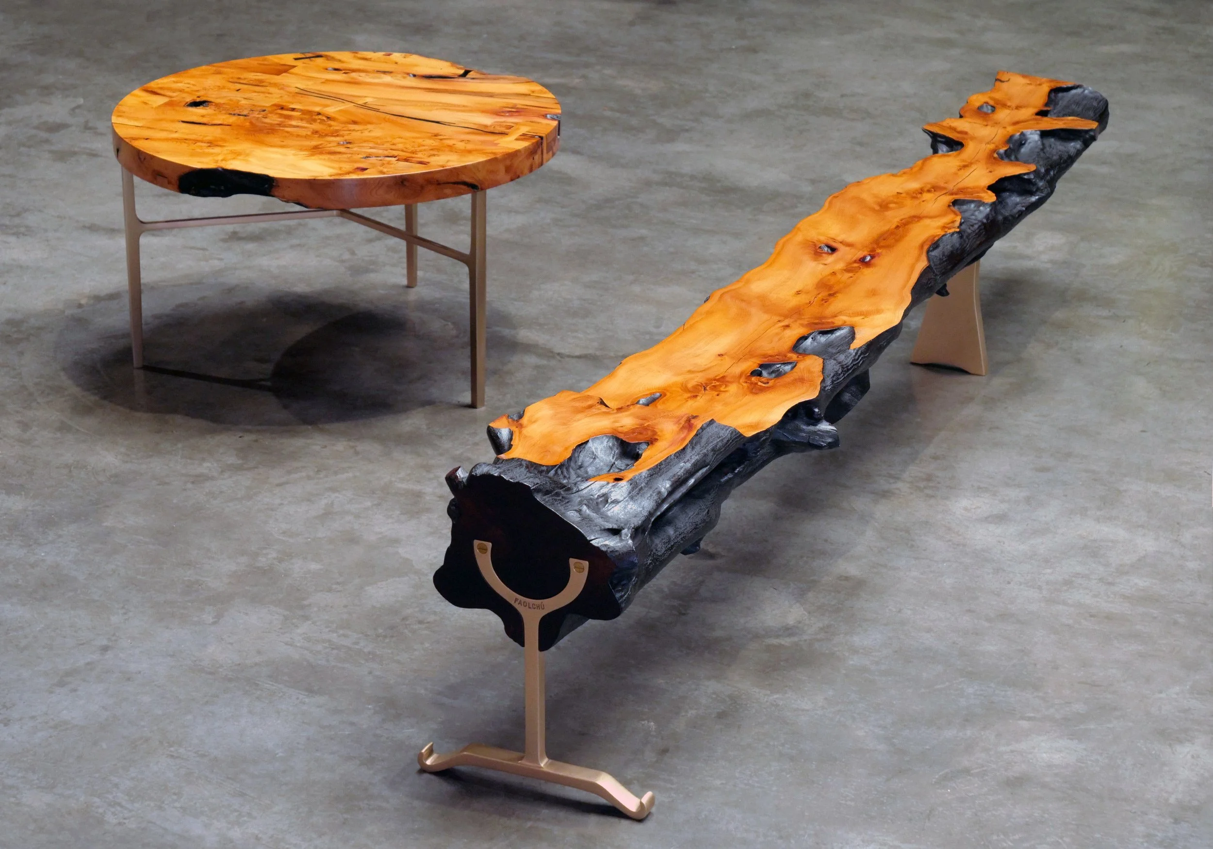 Sculpted Scottish yew log, ebonised trunk with cast bronze horseshoe and wedge legs.